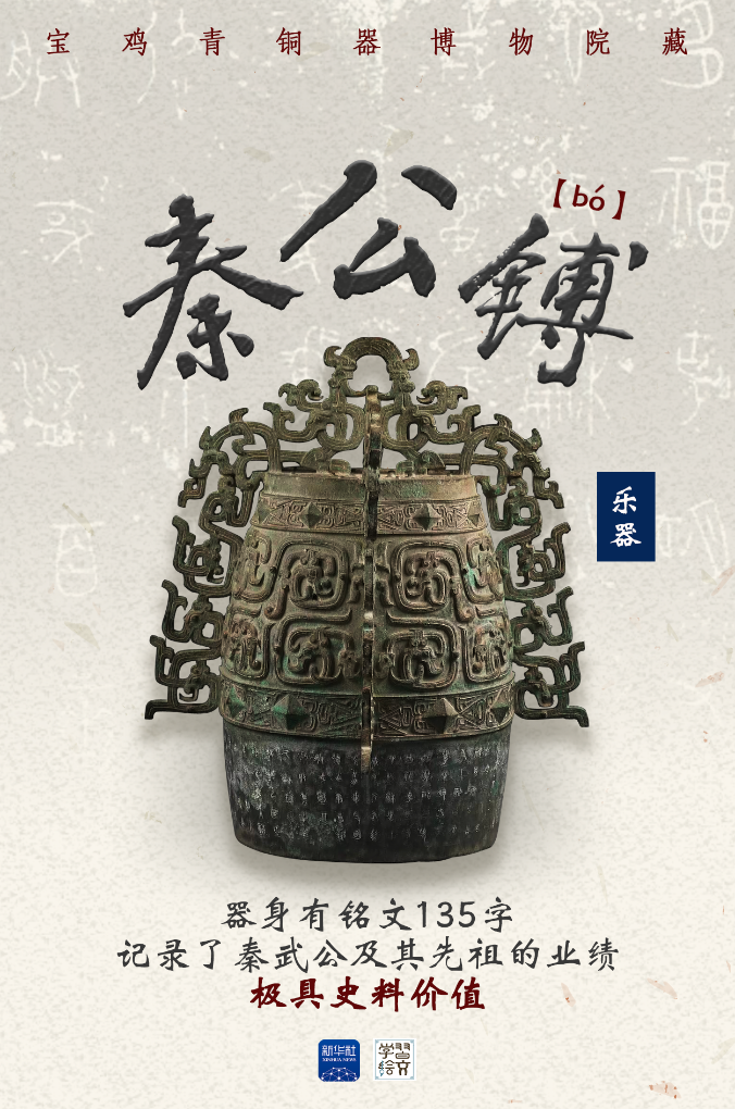 这件秦公镈是大型打击乐器,器身有135字铭文,记述了秦襄公被周平王“赏宅受国”的历史,以及文公、静公、宪公三代治国兴邦的业绩,是研究秦国早期历史的重要实物资料。