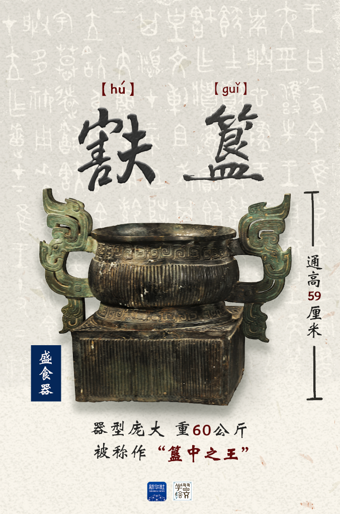 现展出于宝鸡青铜器博物院的㝬簋号称“簋中之王”。圆形簋身与方形底座相连,簋内铸有铭文124字,由此得知它是西周第十位天子周厉王姬㝬为祭祀先祖、祈神降福而作。