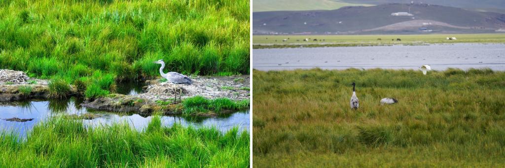 拼版照片:左图为9月4日在甘肃省尕海湿地拍摄的苍鹭。新华社发(拉玛才旦摄);右图为9月5日在四川省若尔盖花湖湿地拍摄的黑颈鹤。新华社记者 胥冰洁 摄