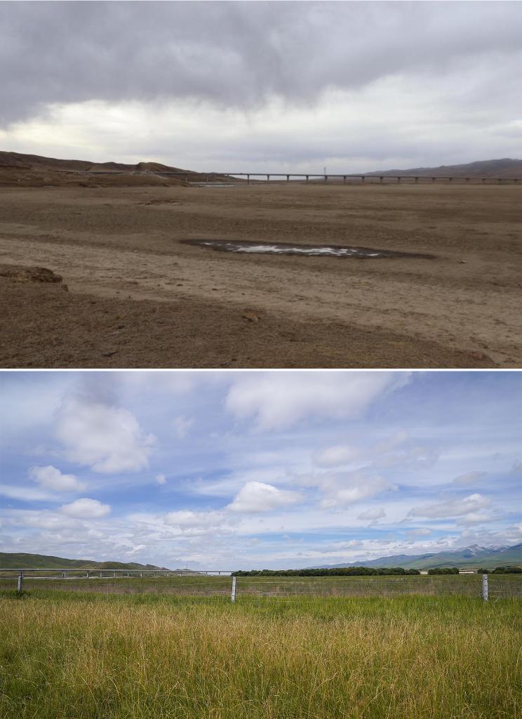 拼版照片:上图为若尔盖县辖曼镇西仓村沙化土地治理前的场景。新华社发(资料照片);下图为该处采用“高山柳沙障+植灌+种草+施肥+围栏+管护”的措施进行综合治理后的场景(9月6日摄)。新华社记者 胥冰洁 摄