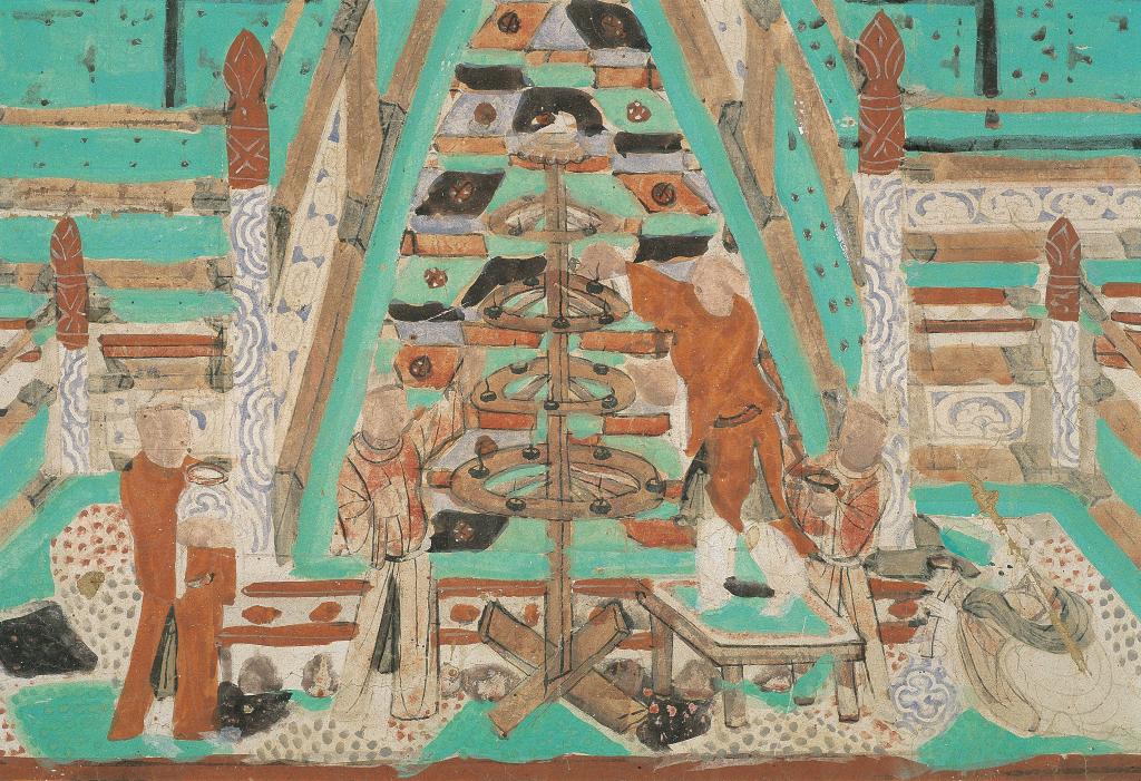 花好月圆夜,人们摆设香案、放置供品,敬奉月神。敦煌研究院介绍,在莫高窟第103窟的壁画中,描绘了古人们头顶明月、围绕宝塔祭拜的场景。