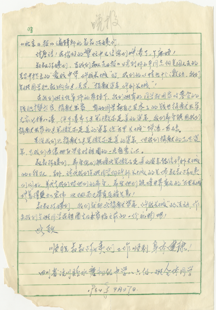 四川省汶川县水磨初级中学八六级一班全体同学给《北京日报》编辑部来信(资料照片,北京日报社供图)