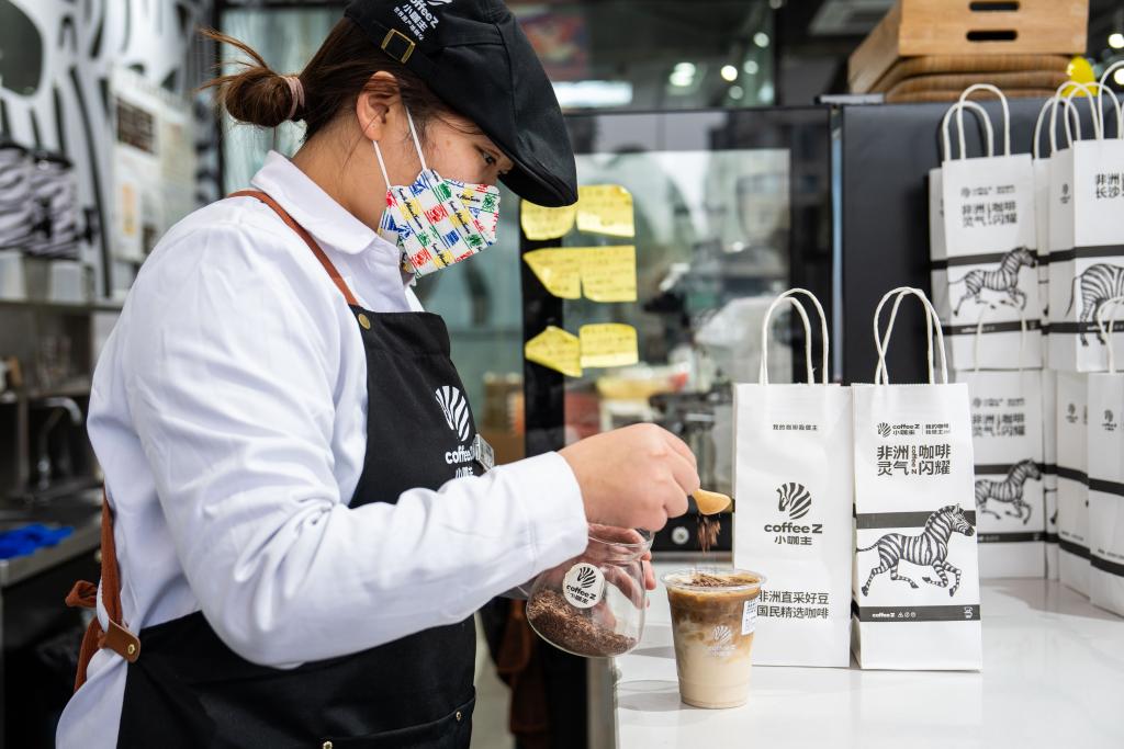 2024年1月31日,在湖南高桥大市场非洲咖啡交易中心,咖啡店工作人员在制作咖啡饮品。新华社记者陈思汗摄