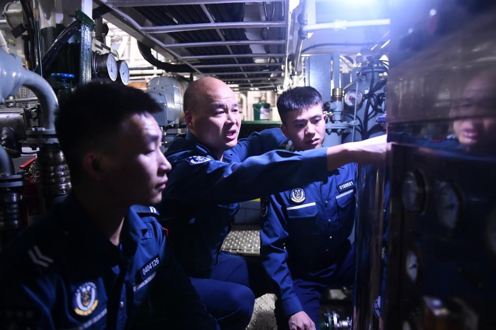 9月15日,在中国南沙仙宾礁附近海域,海警南域舰执法员汤建维(中)与刘鑫(右)、张宏宇在机舱工作。新华社记者 刘力航 摄