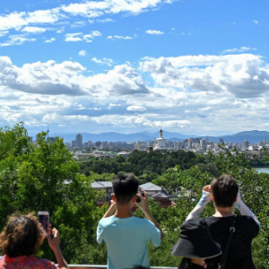2024年8月12日北京天气晴好,游客从景山上拍摄远处的北海公园。新华社记者李鑫 摄