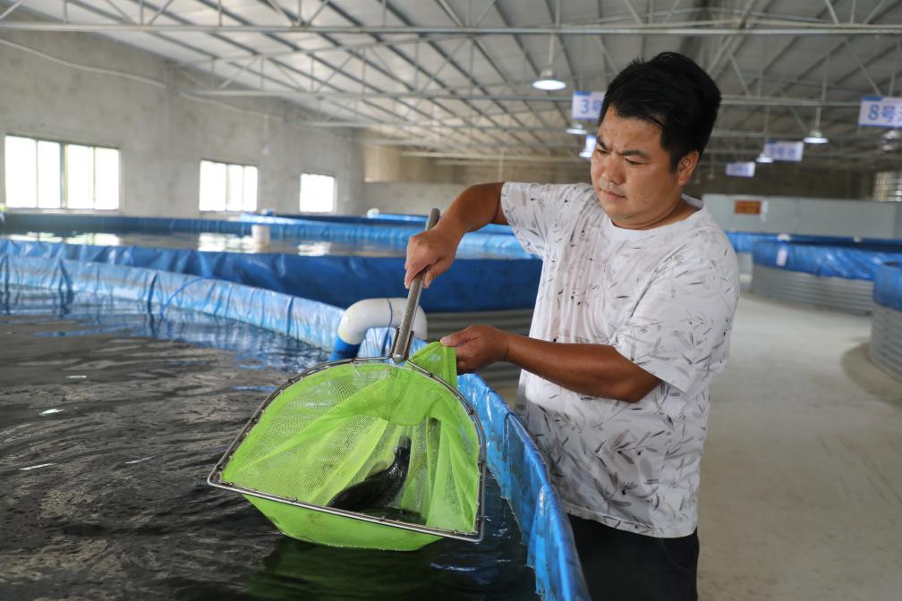 图为贵港市鑫海水产种苗养殖示范区工人正在检查鱼苗生长情况。(何美帆 摄)