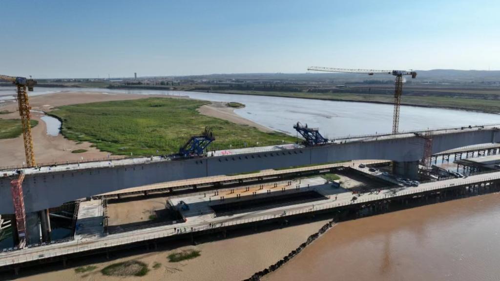 这是9月22日拍摄的包银高铁磴口黄河特大桥施工现场。(中国铁路呼和浩特局集团有限公司供图)