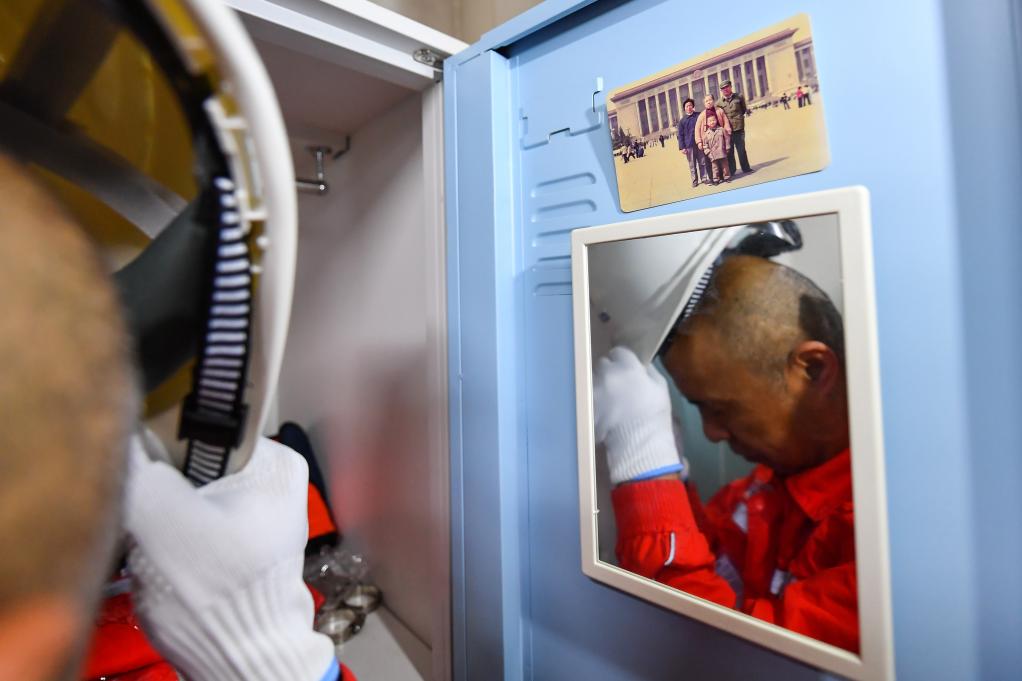 9月17日中秋节,结束一天工作的郑建国在生活楼区域与在陆地的妻子和孩子视频通话。