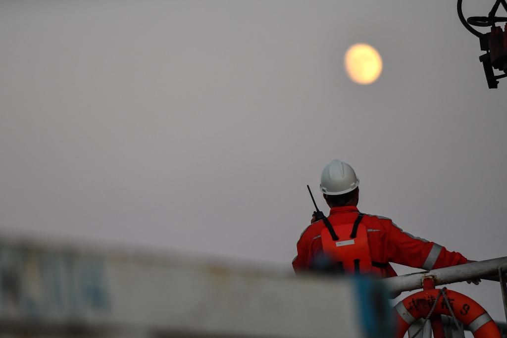 9月16日傍晚,在渤海油田曹妃甸6-4油田中心平台值班船上,郑建国看着从海上升起的明月。