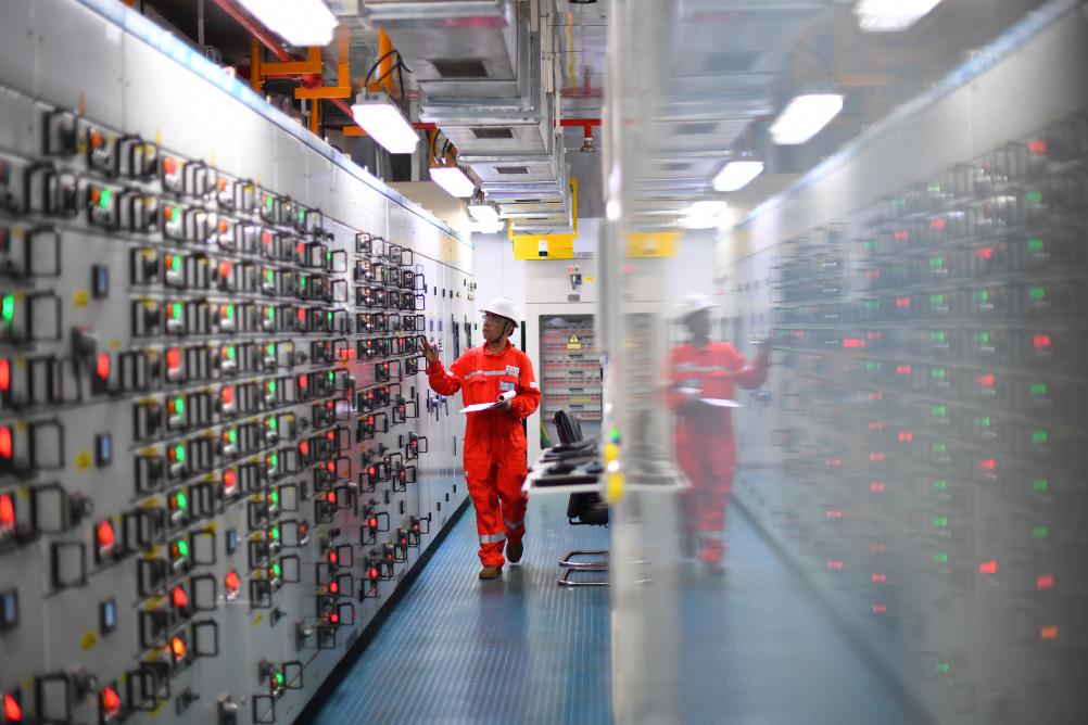 9月17日中秋夜,在渤海油田曹妃甸6-4油田海上平台,郑建国在检查设备运行状况。