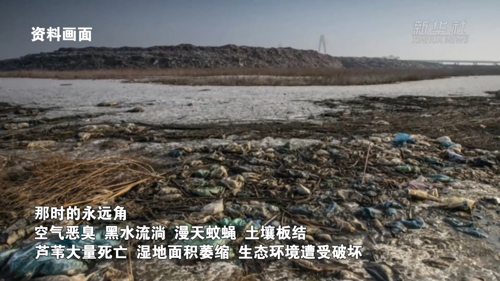 如今的永远角湿地,芦苇摇曳,鸟类云集。但谁能想到,几年前这里还有一座当地有名的“垃圾山”。那时的永远角,空气恶臭、黑水流淌、漫天蚊蝇、土壤板结,芦苇大量死亡,湿地面积萎缩。