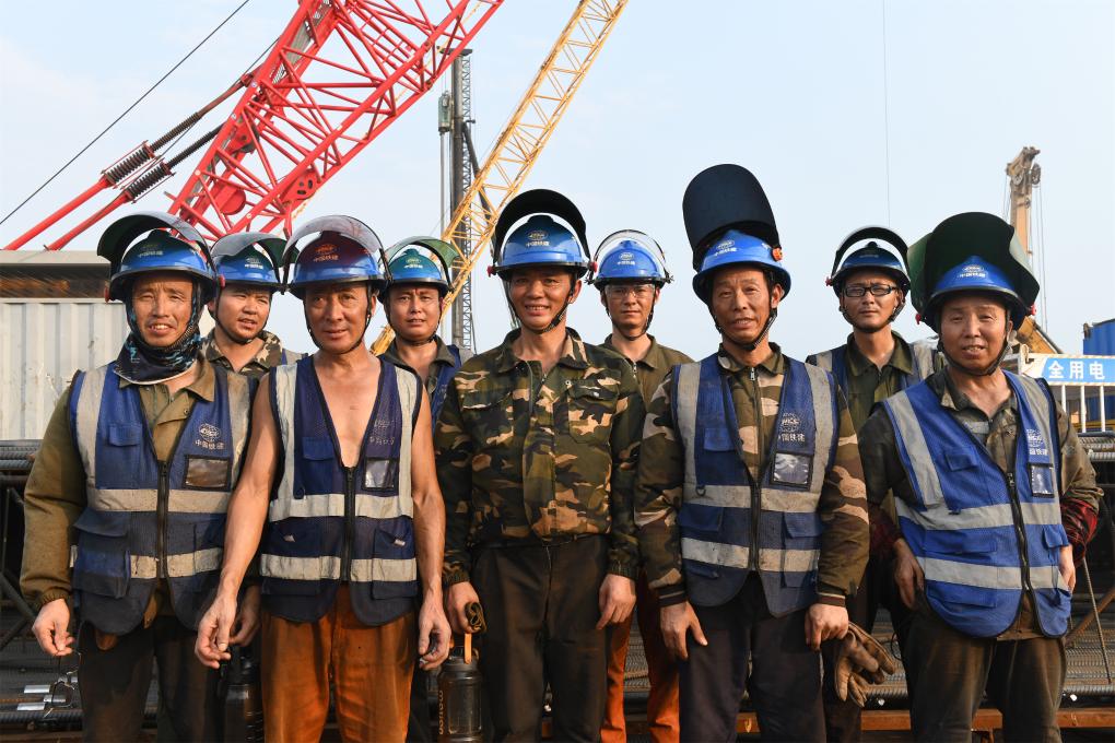 胡建国(左一)带着他的仡佬族工友们,焊接钢筋笼(8月27日摄)。