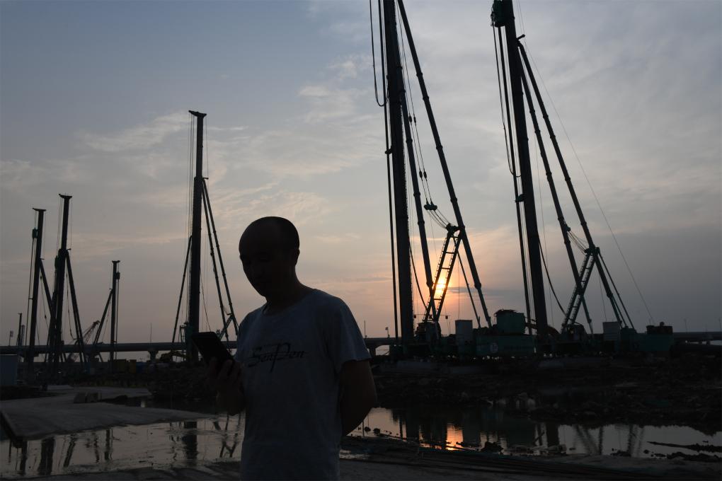 胡建国在粤港澳大湾区重点基础设施项目南珠中城际铁路的建设工地上(9月12日摄)。