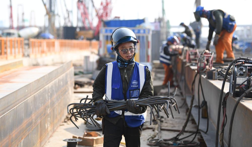 胡建国和工友们一起,把不同型号的钢筋抬放到简易工台上,连接拼装起来,为焊接作准备(9月12日摄)。