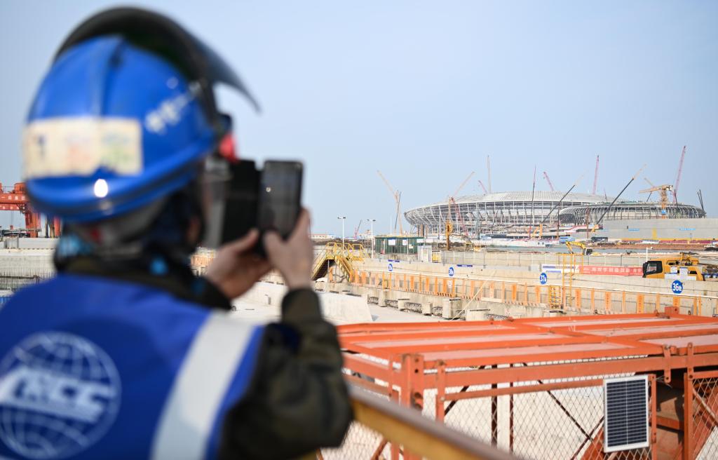 胡建国在工作间隙拍摄远处的南沙全民文化体育中心综合体(8月27日摄)。