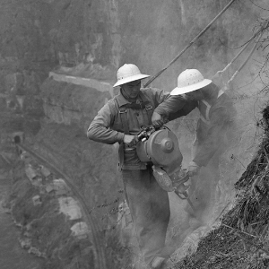 1974年3月,四川西昌铁路分局乌斯河工务段工人排除大渡河两侧悬崖峭壁上的危岩和孤石,保证成昆铁路安全通车。新华社记者 李基禄 摄
