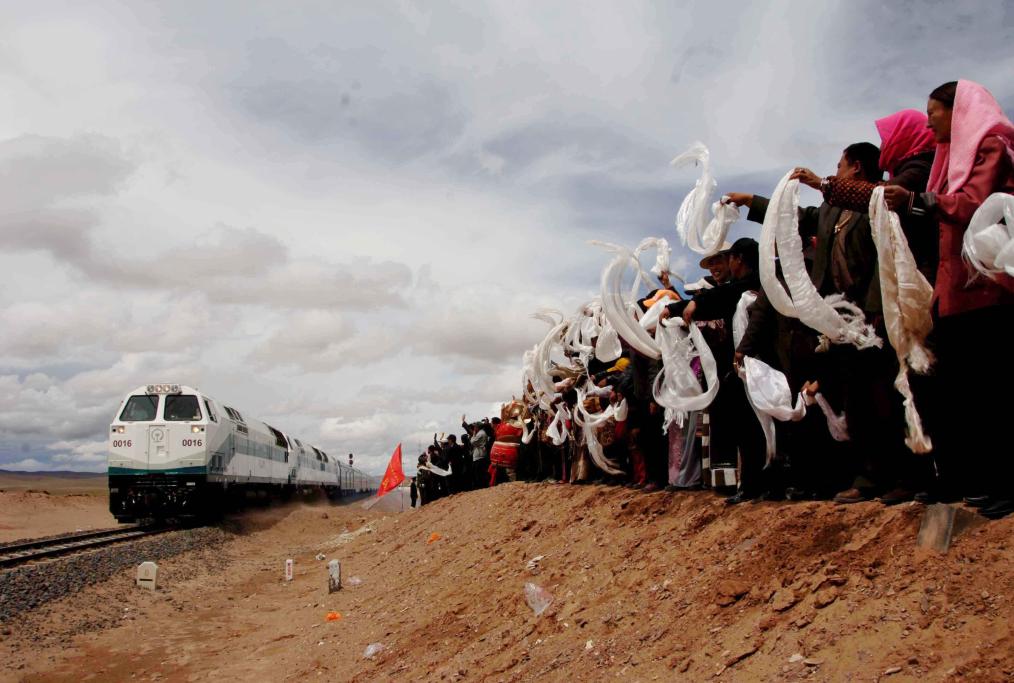 2006年7月1日,青藏铁路全线通车。在青海沱沱河大桥桥头,当地群众欢迎从格尔木出发的“青1”次列车。新华社记者 陈燮 摄