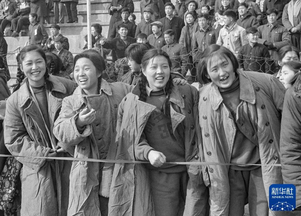 1964年3月8日,北京举行庆祝“三八”杯女子长跑接力比赛,场边身穿军大衣的女青年们观看比赛。新华社记者 黄景达 摄