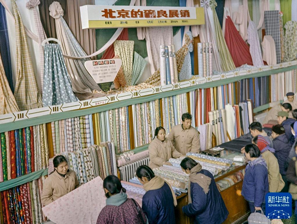 1974年,北京东四人民市场内的确良展销专柜一角。新华社记者 郑书福 摄