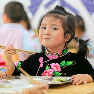 2017年9月6日,在贵州黔东南苗族侗族自治州凯里市易地扶贫搬迁后新建开园的开怀街道第十三幼儿园,新入园的4岁苗族小女孩潘承玥在吃免费营养午餐。新华社发(吴吉斌 摄)