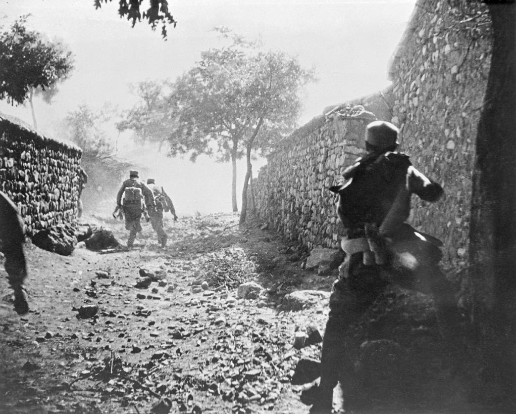 彼时的袁苓身上背着枪、手榴弹和干粮袋,全部装束和普通战士别无二致,只是手里多了一台相机。当他冲上战场拍摄解放军战士们猛扑敌阵镜头的时候,几乎同一时间,袁苓身后的战友郝建国拍下了他拍照的背影。那一年,袁苓和郝建国都只有23岁。
