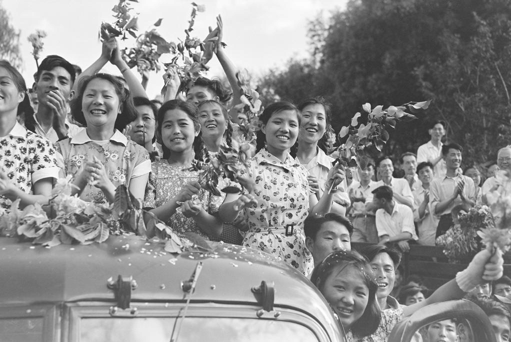 1956年7月14日,在吉林长春“一汽”首批解放牌卡车下线的仪式上,身穿花衣裙的姑娘与身着白衬衫的男青年们站在车上。照片拍摄者是当年在战场上出生入死的新华社战地摄影记者袁苓,新中国成立后,他成为新中国工业发展成就的见证人,定格了这一生动瞬间。
