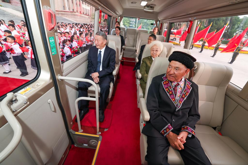 “人民卫士”巴依卡·凯力迪别克望向窗外,嘴里不住念叨:“真好看!”“娃娃们真好!”