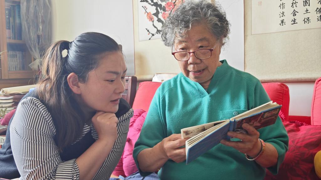 2024年5月,孙嘉怿(左)在北京看望志愿军老兵,了解志愿军当年在朝鲜的安葬情况。新华社发