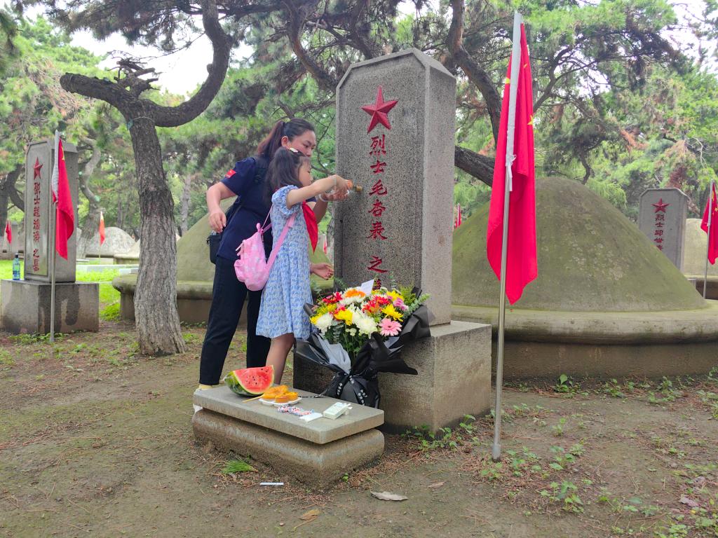 2023年7月,孙嘉怿带女儿在沈阳抗美援朝烈士陵园祭扫家乡英烈。新华社发