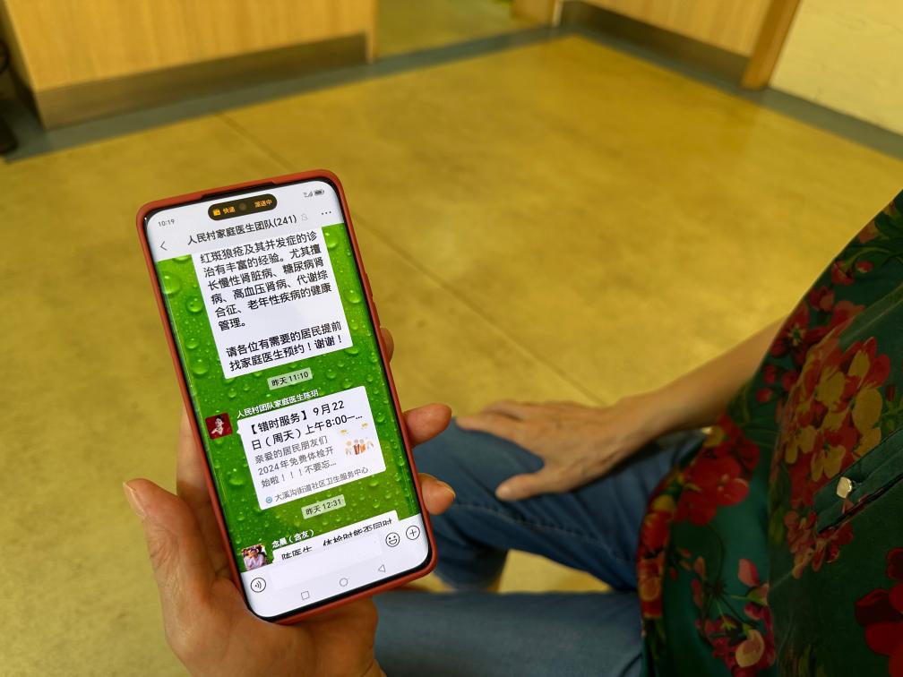 耿跃明正在翻阅她的家庭医生群聊。新华社记者李晓婷 摄