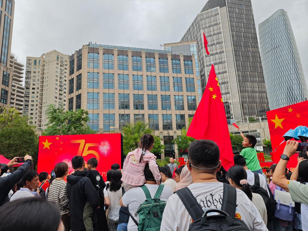 胸前戴着党员徽章,来自广西的潘琦和同事在人群中凝望国旗升起。“我们是前两天来到上海出差的,中共一大会址是工作之余必来的一站,也让我们的国庆节更有特别的意义。”潘琦说。
