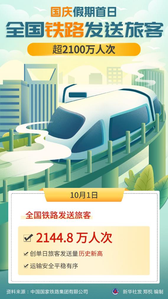 新华社北京10月2日电(记者樊曦、王优玲)记者从中国国家铁路集团有限公司获悉,10月1日,全国铁路发送旅客2144.8万人次,创单日旅客发送量历史新高,运输安全平稳有序。