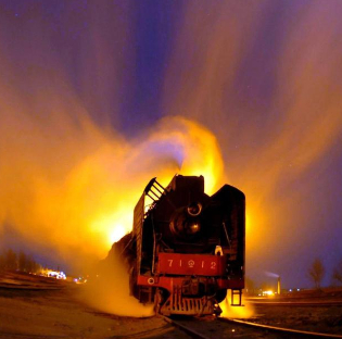 点评 仰角拍摄让飞奔的列车动势向上,车头冒出的浓烟随风飞舞,充满活力。车与桥形成的硬朗线条,尽显雄浑与厚重。