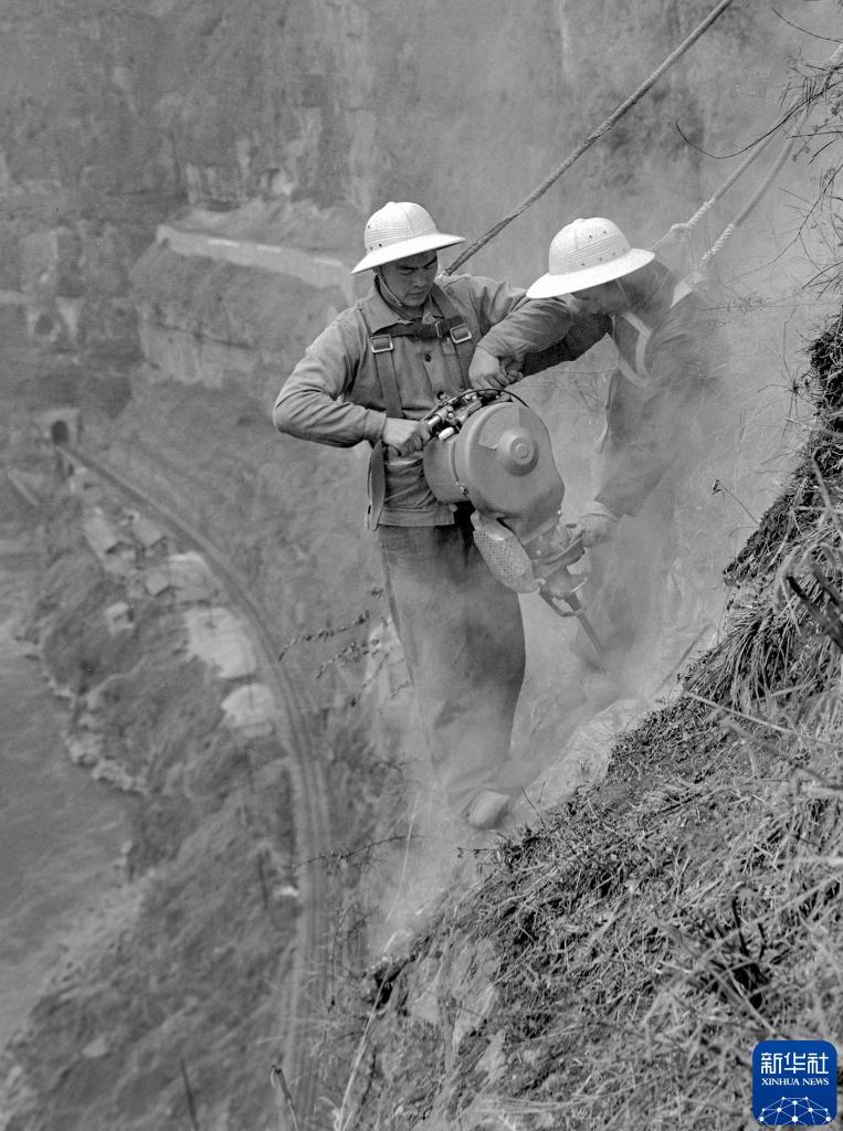 1974年3月,四川西昌铁路分局乌斯河工务段工人排除大渡河两侧悬崖峭壁上的危岩和孤石,保证成昆铁路安全通车。新华社记者 李基禄 摄