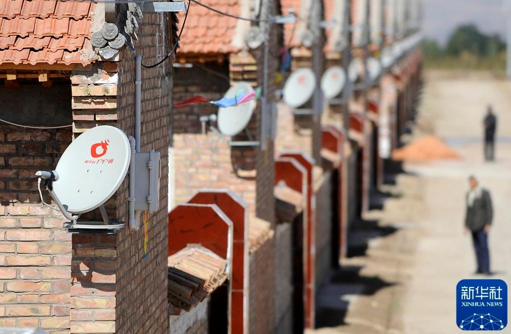 2011年10月14日,宁夏固原三营镇团结村房屋外整齐排列着直播卫星接收设备。新华社记者 王鹏 摄