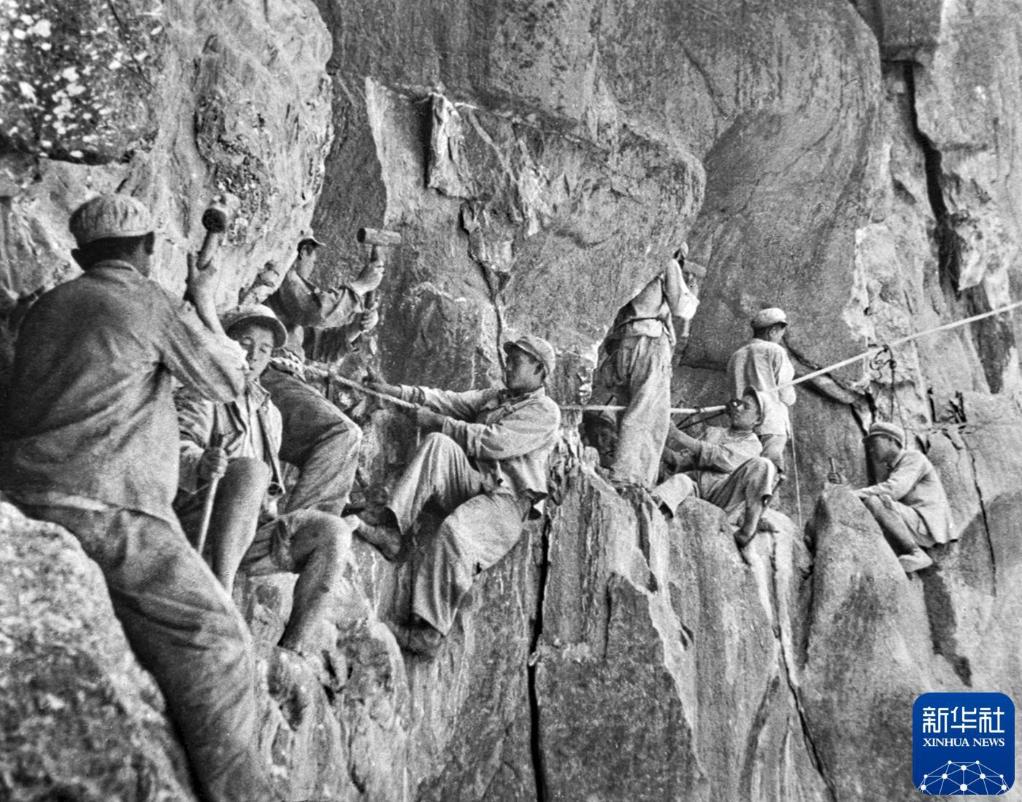 川藏公路筑路战士在怒江两岸的悬崖陡壁上开山修路。川藏公路1950年开始修建。新华社发(李万春、张加里摄)