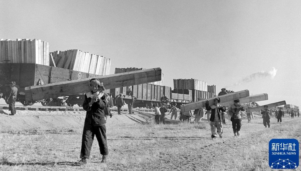 在内蒙古集二线铁路建设中,工人扛着枕木,前往铺轨地点。集二线铁路1953年5月开工建设。新华社记者 邹健东 摄