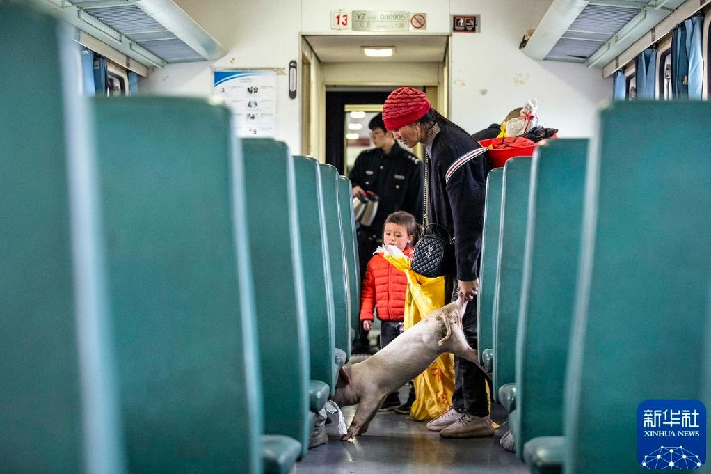 2021年4月11日,在5633次列车上,乘客带着的小猪从袋子里爬了出来。新华社记者 沈伯韩 摄