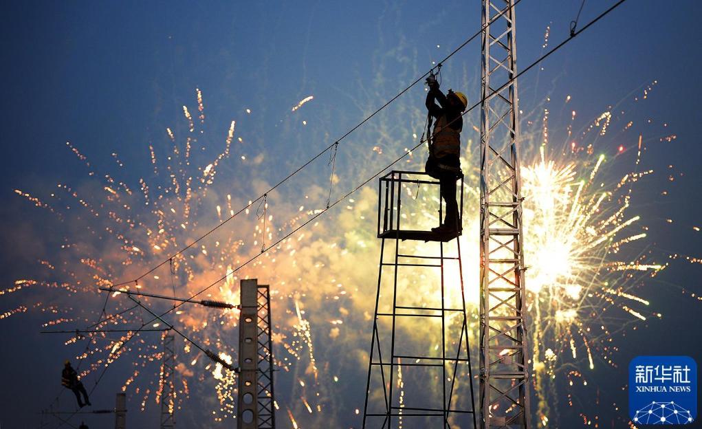 2020年1月7日,在西安火车站改扩建工程新丰至窑村段施工现场,中铁七局铁路建设者进行铁道线路接触网施工。新华社记者 刘潇 摄