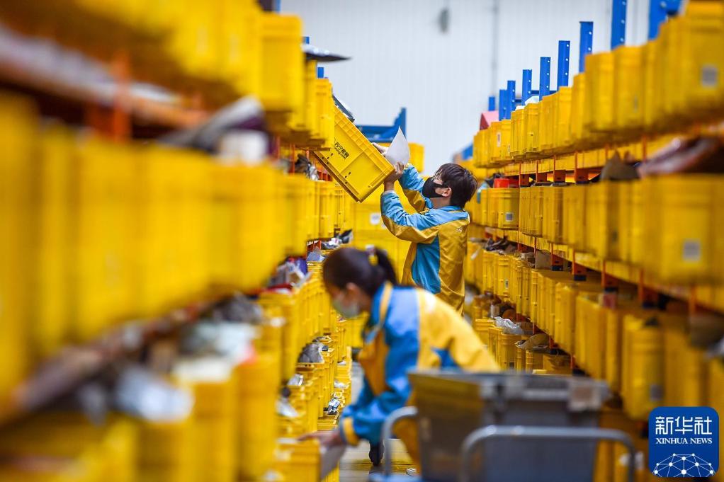 2022年11月10日,江苏南京江宁区苏宁华东物流中心的工人在拣选物品。新华社发(方东旭 摄)