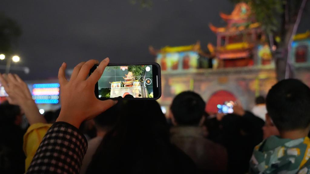 观看光影秀的市民游客纷纷拍照留念。新华社发