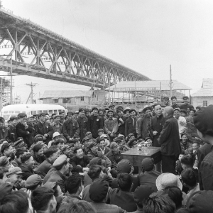 1957年4月,著名相声演员侯宝林、郭启儒于武汉长江大桥合龙前夕,在工地向工人们作慰问演出。新华社发