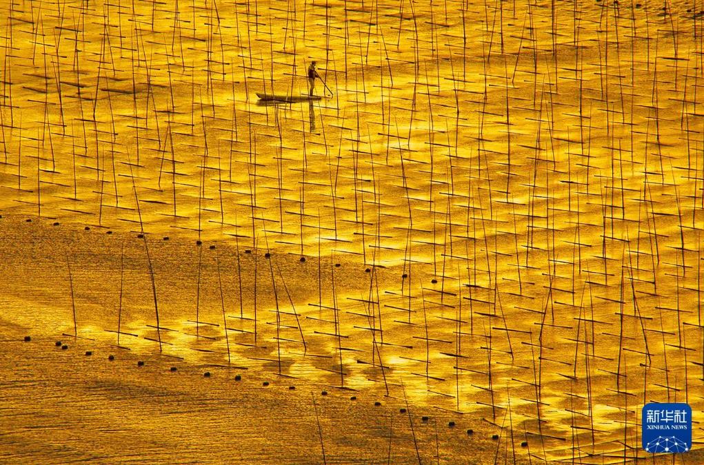点评 阳光把水面打成金黄,水面林立的细杆形成纵向动线,风过水面形成的波纹制造横向的乐感,劳作中的渔民怡然自得,画面呈现诗意浪漫。