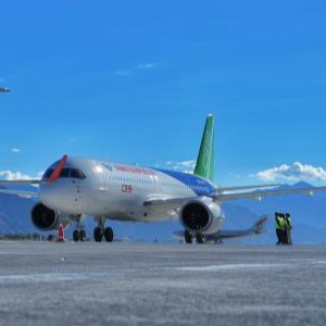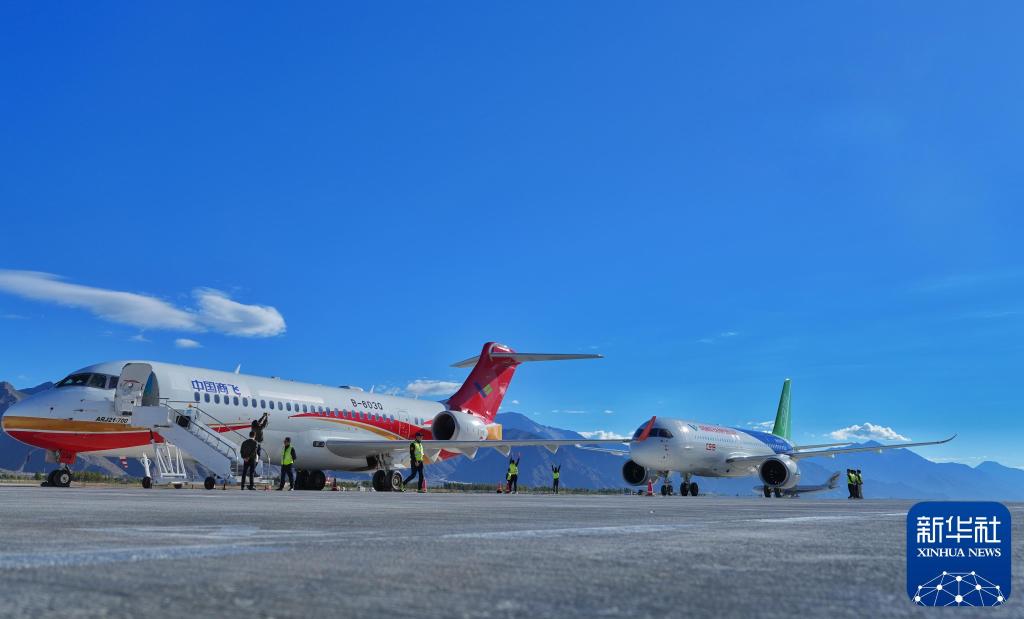 2024年9月19日,一架C919飞机(右)与一架ARJ21飞机停放在西藏拉萨贡嘎国际机场停机坪上。