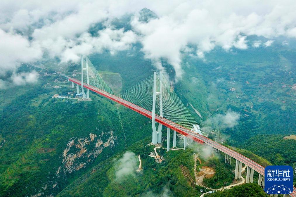 2018年8月9日拍摄的北盘江大桥。北盘江大桥跨越云南和贵州交界的大峡谷,大桥上空云雾缭绕。