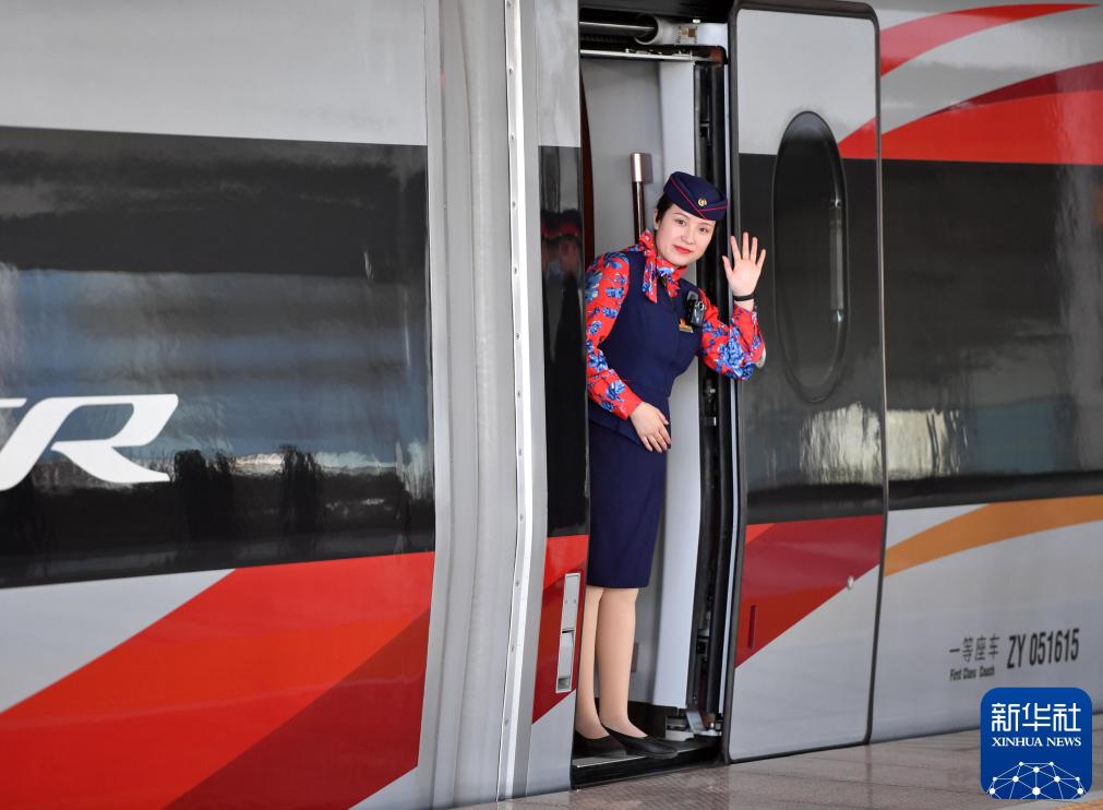 2023年12月8日,济郑高铁全线贯通运营,济郑高铁郑州东站首发G4830次列车乘务员向旅客挥手致意。