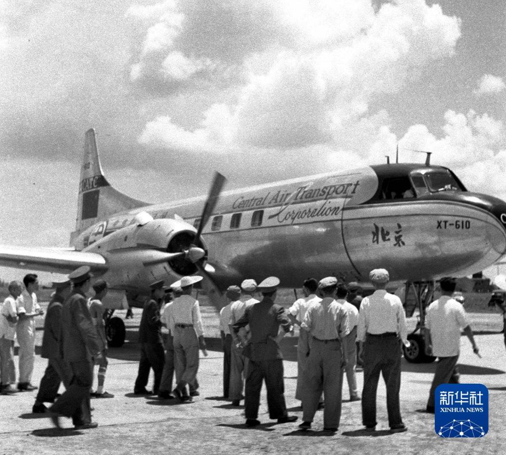 1950年,中国民用航空正式开航。图为开航后安全抵达汉口机场的“北京”号客机。