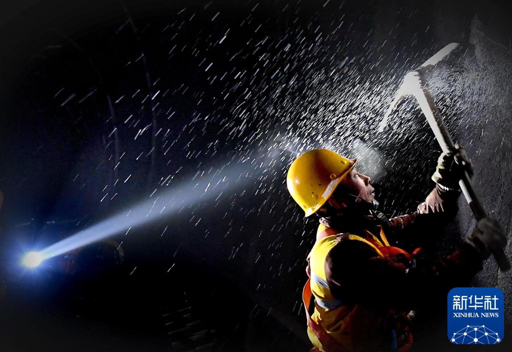 2018年1月25日,打冰队队员在河南省三门峡市观音堂隧道内作业。