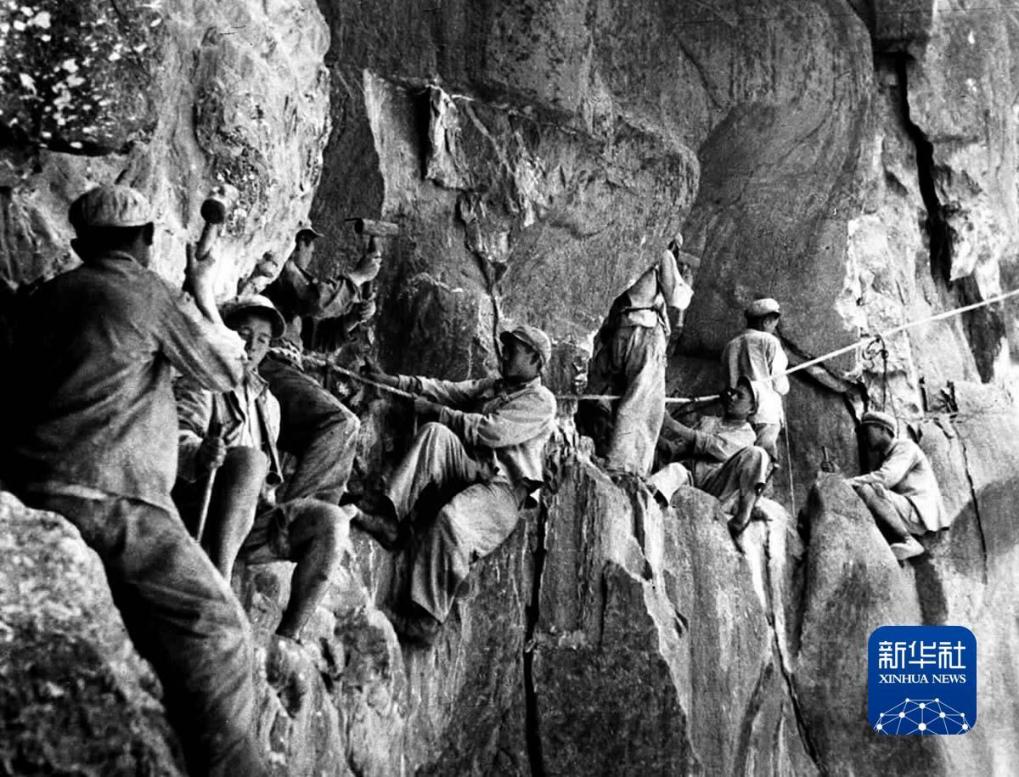 川藏公路筑路战士在怒江两岸的悬崖陡壁上开山修路。川藏公路1950年开始修建。