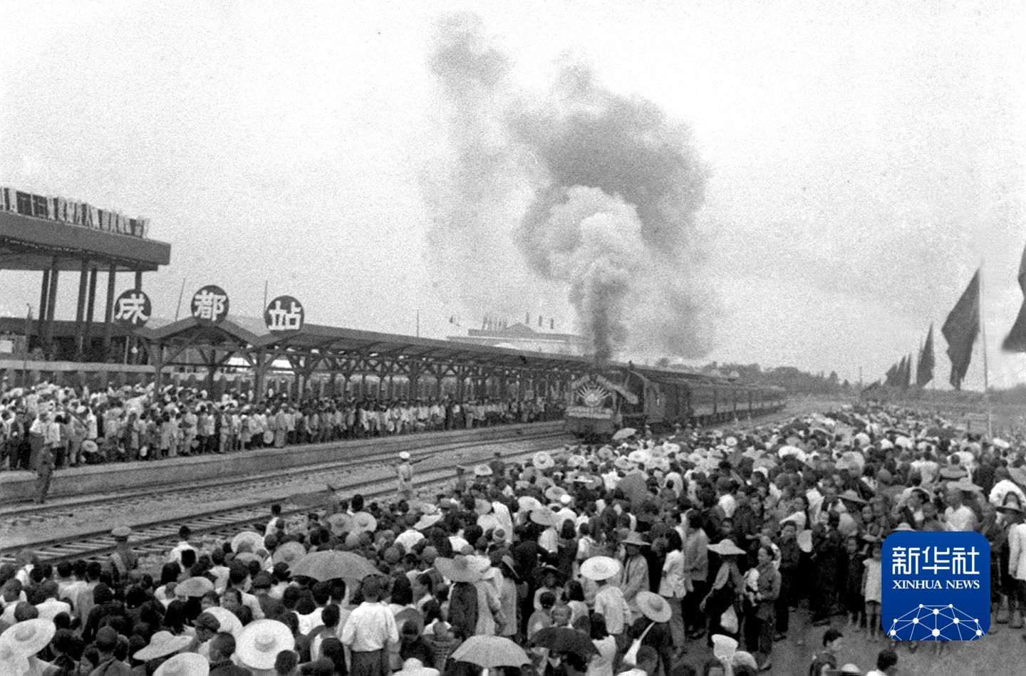 1952年7月1日,新中国自行修建的第一条铁路——成渝铁路上的第一列火车由重庆开出,2日上午抵达成都车站,受到各界人民的热烈欢迎。